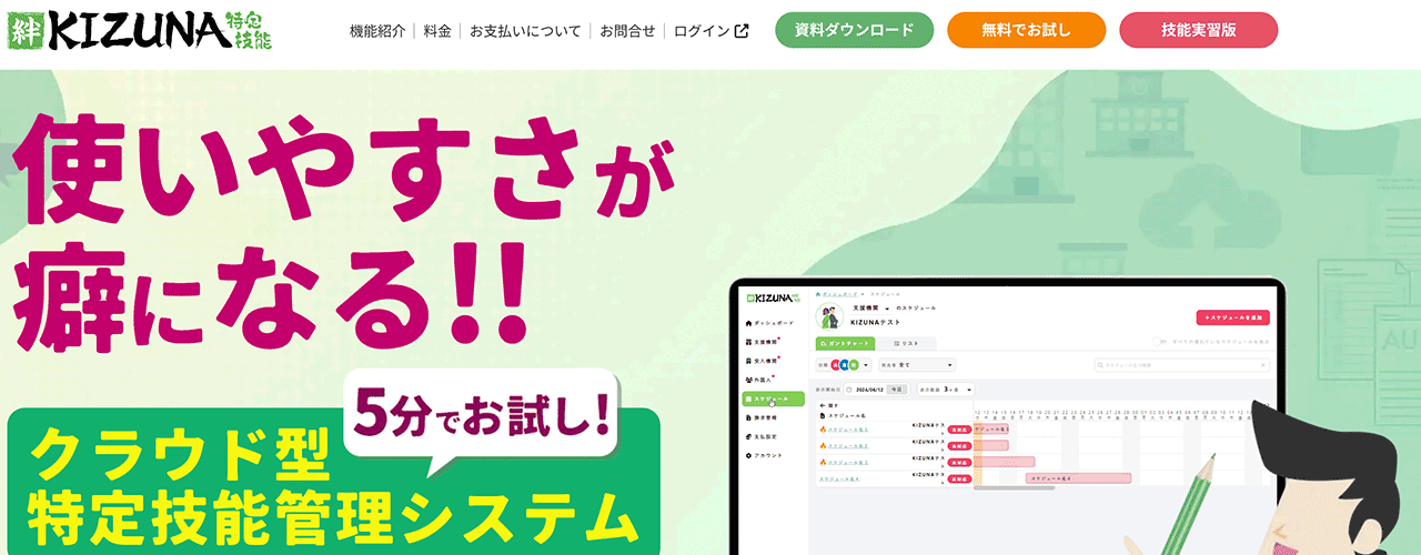 使いやすさを追求した特定技能管理システム。登録した情報を活⽤し、業務負担を減らします。情報の管理以外にも、ファイル保管やスケジュール管理まで⼀元で⾏える業務管理システムです。