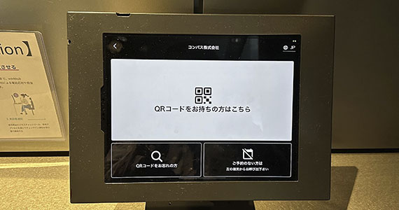 来訪先を選択する画面が出るので『コンパス株式会社』を選択し、次に『QRコードをお持ちの方はこちら』を選択し、画面の指示に従ってQRコードをかざしてください。