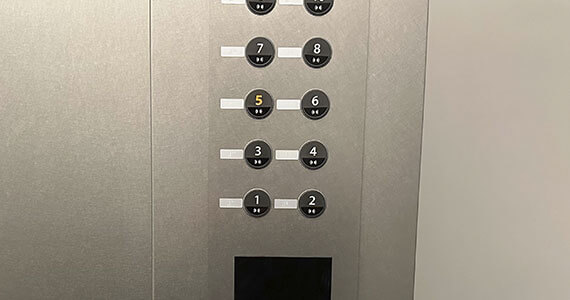 QRコードをかざすと横の自動ドアが開くので、エレベーターに乗りましたら、5Fを押してください。